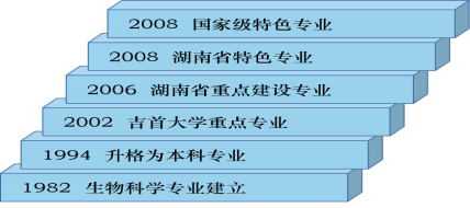 生物科学专业始建于1982年。40年间,从普通本科专业成为湖南省一流专业和国家特色专业。专业支撑了生态学和生物学2个学术型硕士学位授权点,生物医药和资源环境2个专业型硕士点,支撑了“生态扶贫服务国家特殊需求博士人才培养项目”。目前,生态学学术型博士学位授权点已进入国务院学位办审核。