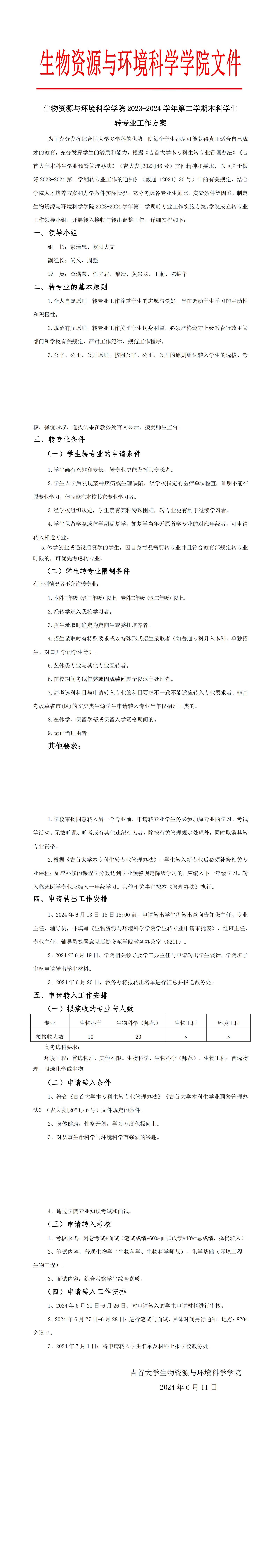 生物资源与环境科学学院2023-2024学年第二学期本科学生转专业工作方案