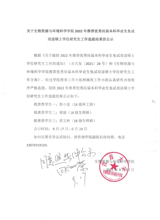 关于生物资源与环境科学学院2022年推荐优秀应届本科毕业生免试攻读硕士学位研究生工作选拔结果的公示