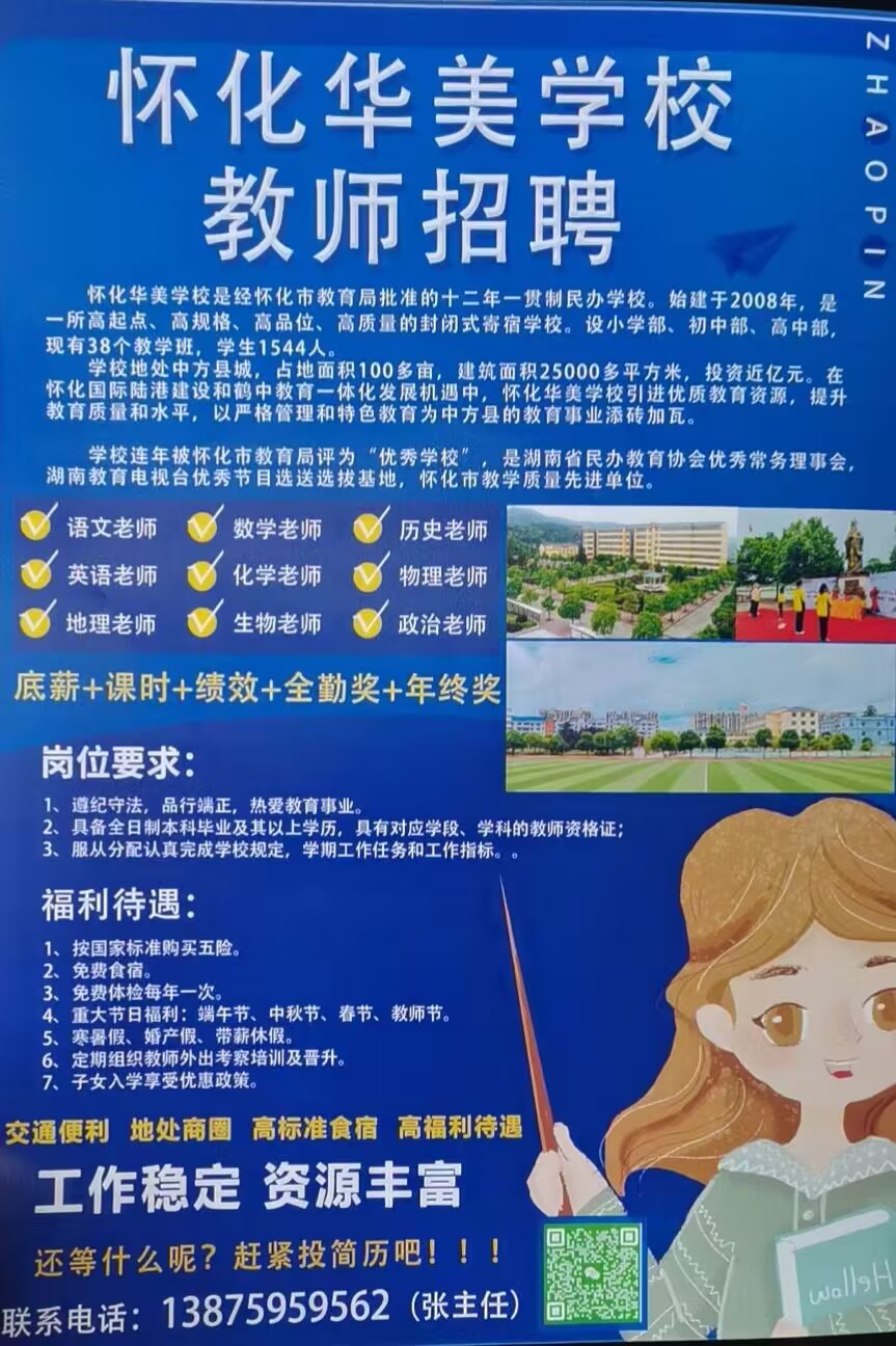 怀化华美学校教师本次招聘的是初中、高中各学科老师。