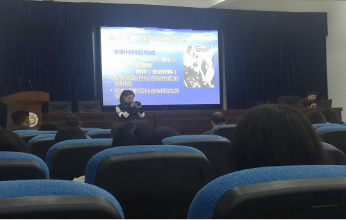 罗江华分别从大学生的就业心理问题、就业信息收集、简历制作和面试礼仪进行了讲解。