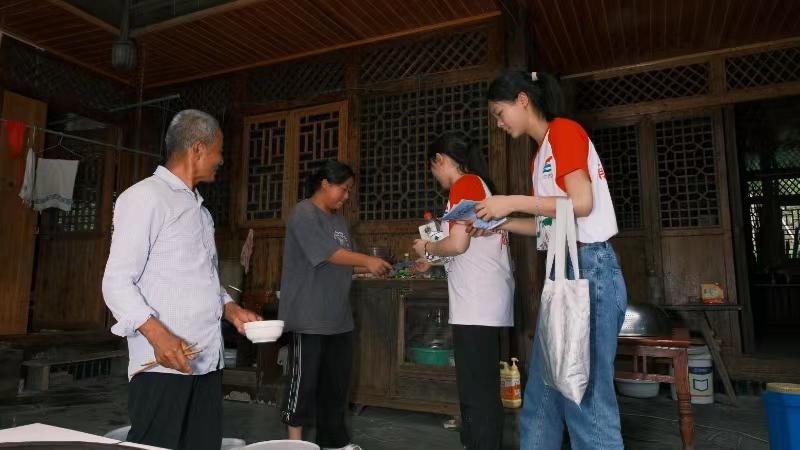 (图为志愿者向村民宣传国家资助政策)
