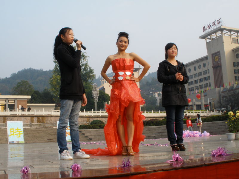 环保服装秀经过初选,11件参赛作品进入决赛。11月16日,在团结广场,在精心布置的美轮美奂的T台上,模特们积极展现自己的作品,展现自己的创意,展现自己的环保理念,展现自我。各位参赛选手大胆的运用各种材料,作出了一件件让评委老师、同学以及在场观众赞叹不已的作品,表演者在这个舞台上将自己的特长发挥的淋漓尽致,同时爱好服装设计的同学也在这里得到了肯定。现场有人感叹:“他们的服装绝不逊色于巴黎时装周上大师的作品!”其中,有几件作品让我印象特别深刻:一件尽显高贵典雅的红色礼服——有谁可以想到这是由大红色的塑料袋拼凑而成;一套天使与美人鱼相结合的服装,尽显淡雅、纯洁——又有谁能想到,这仅仅是由破旧的衣服和废弃的蚊帐裁制而成,而那让人产生无尽遐想的天使的翅膀,竟然是由白色的一次性桌布制成;还有像黑色情节等系列作品都让人难以忘怀。在舞台下欣赏的观众更是热情高涨,他们的呐喊助威使现场的气氛格外热烈。模特们在现场观众的掌声,尖叫声中倾情演绎,充分展示了大学生的青春,阳光,自信,时尚,以及他们的环保理念。