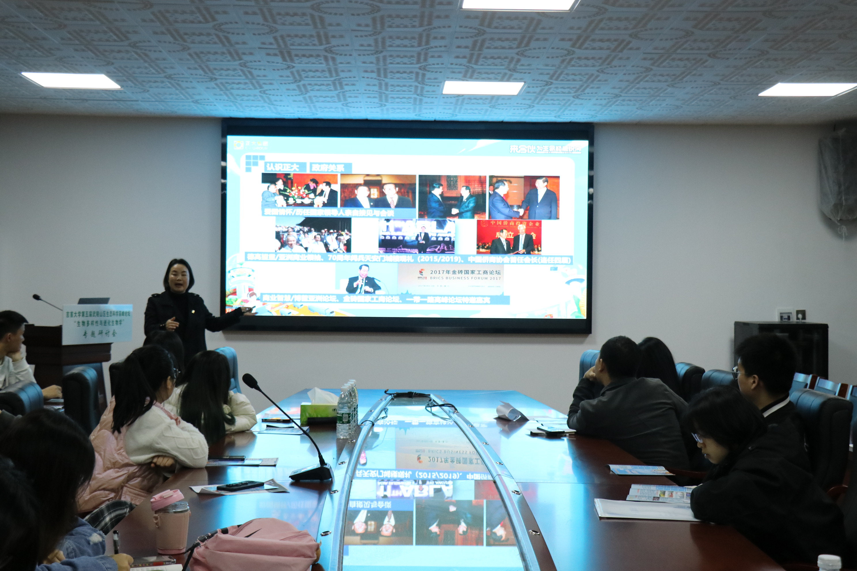 在会议开始前,何斌涛为大家播放了正大集团宣传视频,以帮助同学们更全面、更细致的了解正大企业。接着,由正大有限公司蒋彩云对正大集团和正大有限公司(湖南区)作详细介绍,她主要从公司的薪资待遇和目前岗位需求两方面展开,让同学们更加充分的了解企业的实力和岗位需求情况。随后,黄仁山、鲍荣国、刘苏颖作为师哥师姐代表,先后在会上分享自己在正大的经历及心得体会,并向大家提出首次就业的相关实用性建议。最后,会议进入答疑环节,同学们纷纷提出心中的困惑,并由公司负责人进行一一解答。公司代表们表示,热烈欢迎有意向的同学们投递简历。