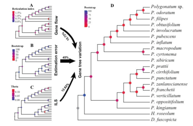 黄精属是黄精族中最大的属,广泛分布于北半球温带地区,以我国西南和亚洲东北部为多样化中心。黄精属的许多物种具有重要的药用和观赏价值,因而对于本属植物的分类和系统发育研究由来已久,但其属下许多物种的系统发育关系仍然有争议。本研究利用Hyb-Seq基因富集获得了黄精属及其近缘类群43种的515个单拷贝核基因和叶绿体全基因组数据。由这些单拷贝核基因和叶绿体序列构建的系统发育树有力地支持黄精属的单系性,并划分为三个主要分支。核基因组树和叶绿体树之间以及属内基因树之间存在明显的冲突,但所有冲突都发生在每个主要分支内。这些冲突会模糊物种间真实的系统演化关系,为了探明造成这些冲突背后的原因,本文利用多个软件进行检测分析。基因渗入检测表明黄精属内的基因流水平低,基因渗入事件弱;网状指数(Reticulation Index)分析表明系统估算错误是造成基因树和物种树进化冲突的主要原因,这可能是由于黄精属植物以根状茎无性繁殖为主,基因变异小,进化速率慢所导致的。